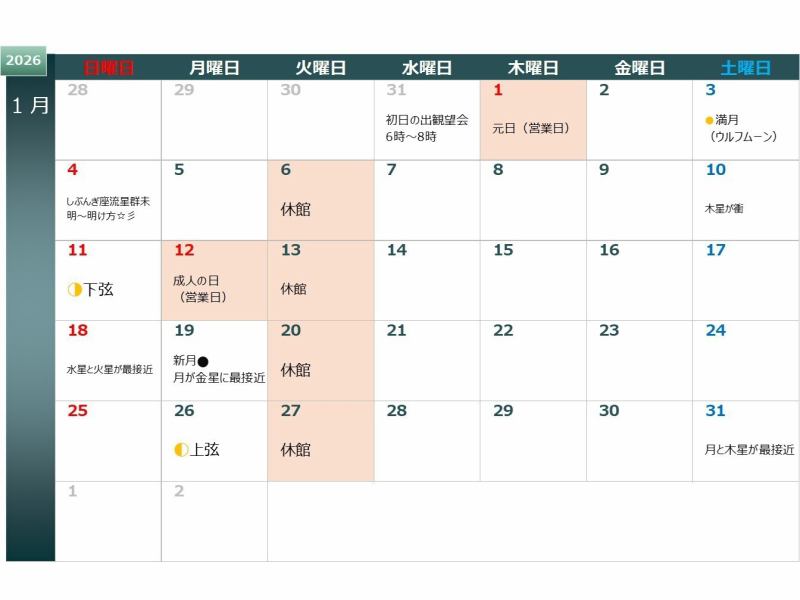 | Astronomical observation party | We carry out every day.(Closed on Tuesdays) High school students and above:800 yen for elementary and junior high school students:400 yen. It currently starts at 7:00 p.m. *If there are many people making reservations, such as on weekends, we will split the reservation into multiple sessions. *The time may change depending on the weather. |